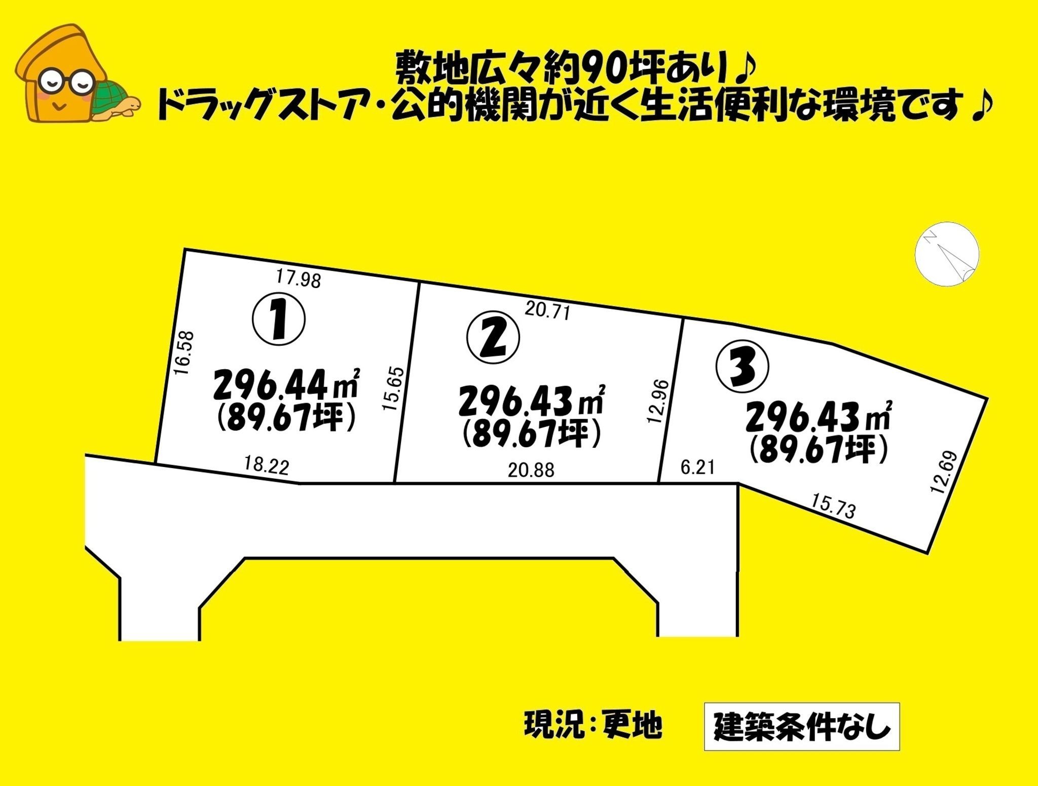 敷地広々約90坪あり♪ ドラッグストア・しまむら・中学校など生活便利な環境です♪ 建築条件はありません!お好きなメーカーで建築可能です♪